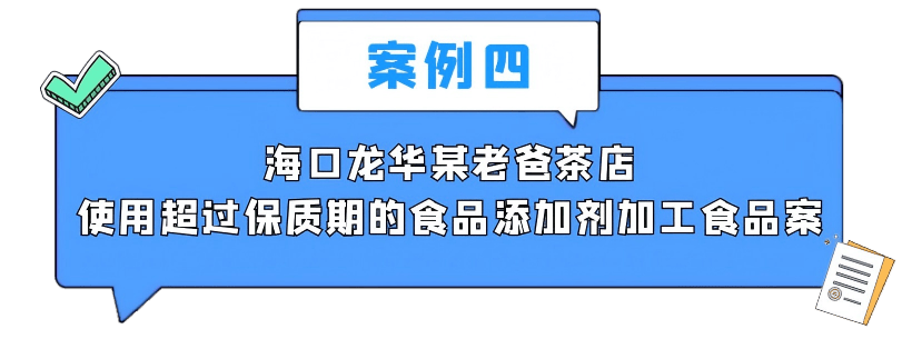 该老爸茶店正在食物加工过程中利用跨越保质期的食物添加剂,违反了《中华人平易近国食物平安法》(2021批改)第三十四条第三项“出产运营用跨越保质期的食物原料、食物添加剂出产的食物”的。鉴于当事人能积极共同市场监管部分查询拜访,照实交接违法现实并自动供给材料,涉案货值金额较小,违法行为持续时间较短,违法行为轻细且未形成严沉社会风险后果,以上景象合适《海南省市场监视办理行政惩罚裁量权合用法则》第十二条的,能够依法减轻行政惩罚。根据《中华人平易近国食物平安法》(2021批改)第一百二十四条第一款第二项之,并连系案件情节及裁量要素,海口市市场监视办理局龙华做出如下行政惩罚1。 跨越保质期的复配着色剂;2。罚款2500元。