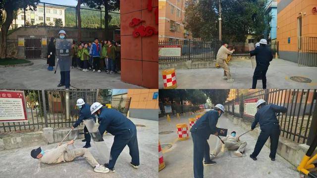 正在宝一平分校新福园中学、宝工中学开展的反恐防暴练习训练中,模仿“暴徒”闯入校园的突发情景。学校安保人员敏捷启动应急预案,使用防暴器械协同共同,成功节制事态。